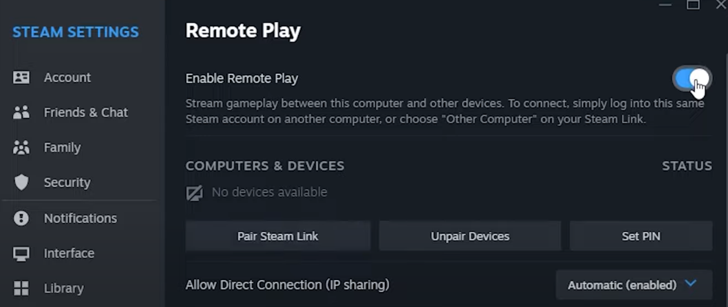 2) PC Steam 클라이언트 설정에서 Remote Play 활성화 (동일한 네트워크 연결 후 진행)