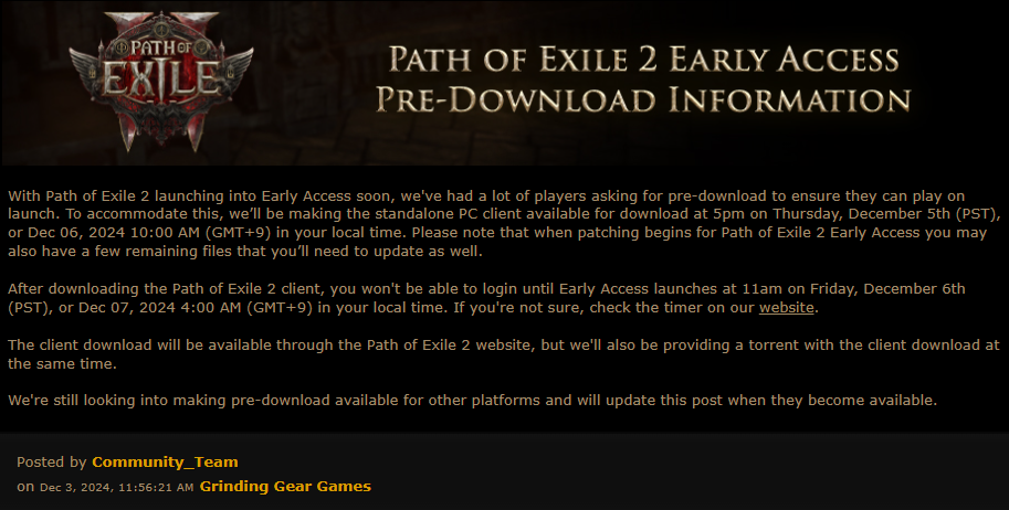 POE2 얼리액세스 사전 다운로드 일정이 공개되었습니다. 한국시간 12월 6일 오전 10시 부터 사전 다운로드가 제공됩니다.