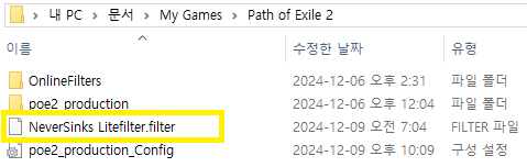 2. 'NeverSinks Litefilter.filter' 파일을 POE2 폴더에 이동시킵니다.