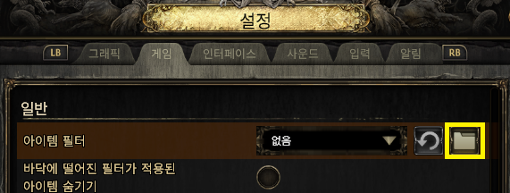 2-1) 게임 접속 후 [설정→게임] 메뉴로 이동해 주신 후 '아이템 필터' 우측 폴더 모양 아이콘을 눌러주세요.