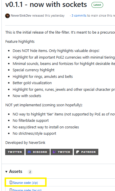 - URL : https://github.com/NeverSinkDev/NeverSink-PoE2litefilter/releases/tag/0.1.1