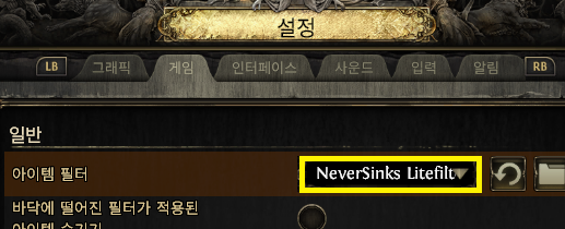 3. 게임을 재시작한 후 [설정→게임] 메뉴로 이동하여 ' 아래와 같이 아이템 필터를 적용해 주세요.
