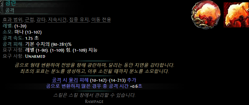 곰으로 형태 변환하여 전방을 향해 광란하며, 달리는 동안 지면을 강타합니다. 최초의 포효는 분노를 생성하고, 이후 소진될 때까지 분노를 소모합니다.